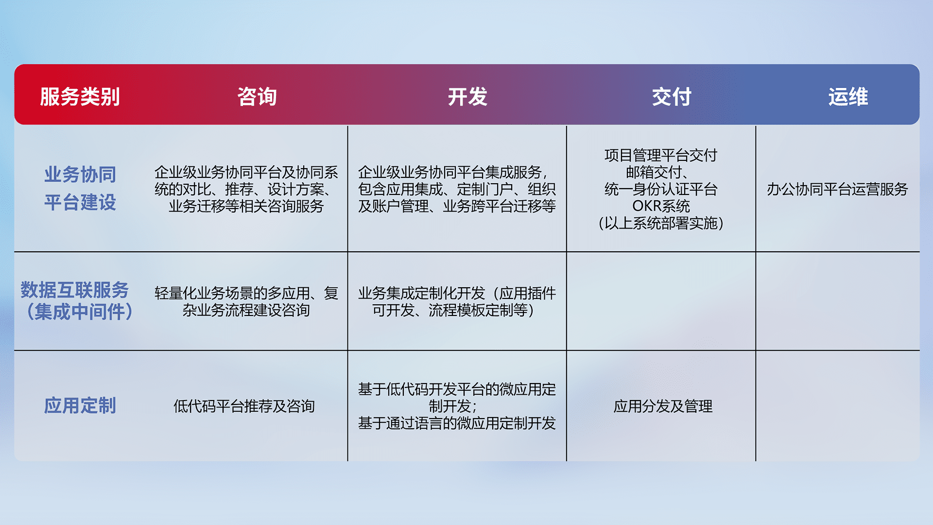 针对钉钉、、、、企微、、IDaas等平台级产品提供产品的规划、、、、方案、、、交付、、、、定制化开发等服务,,实现如统一协同办公、、、、智能客户服务、、、混合会议管理、、智能数据查询、、、等业务场景,,,实现数字化转型。。。